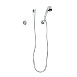 A 60-inch flexible metal hose, supply elbow with flange, swivel connection, handheld shower head and two wall hooks all come together to create Zurn's Temp-Gard Z7000-HW. This plastic chrome-plated hand/wall standard shower unit has 2.5 gpm pressure that balances flowrate and an adjustable spray pattern. The shower head also has the flexibility to be used as either a handheld piece or remain attached to the wall unit. The hose boasts enough length to move freely from the water supply. The two wall hooks can be placed inside or outside the shower to hang other bathroom accessories. Its chrome-plated design makes this a durable shower unit for long-lasting commercial use.